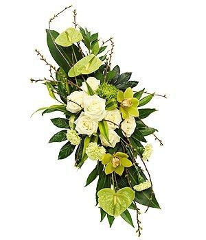 A beautiful white Rose and green Cymbidium Orchid double ended spray with green bloom Chrysanthemums, Anthuriums and Carnations.