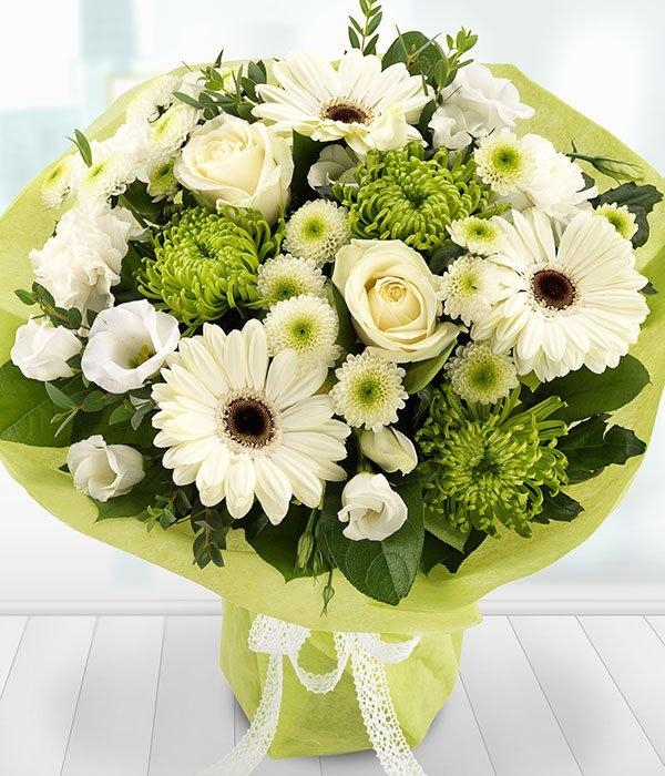A beautiful white bouquet featuring Roses, Gerberas, Lisianthus and Carnations married with white and green Chrysanthemum blooms. A touch of Eucalyptus and Salal complete this gorgeous bouquet.